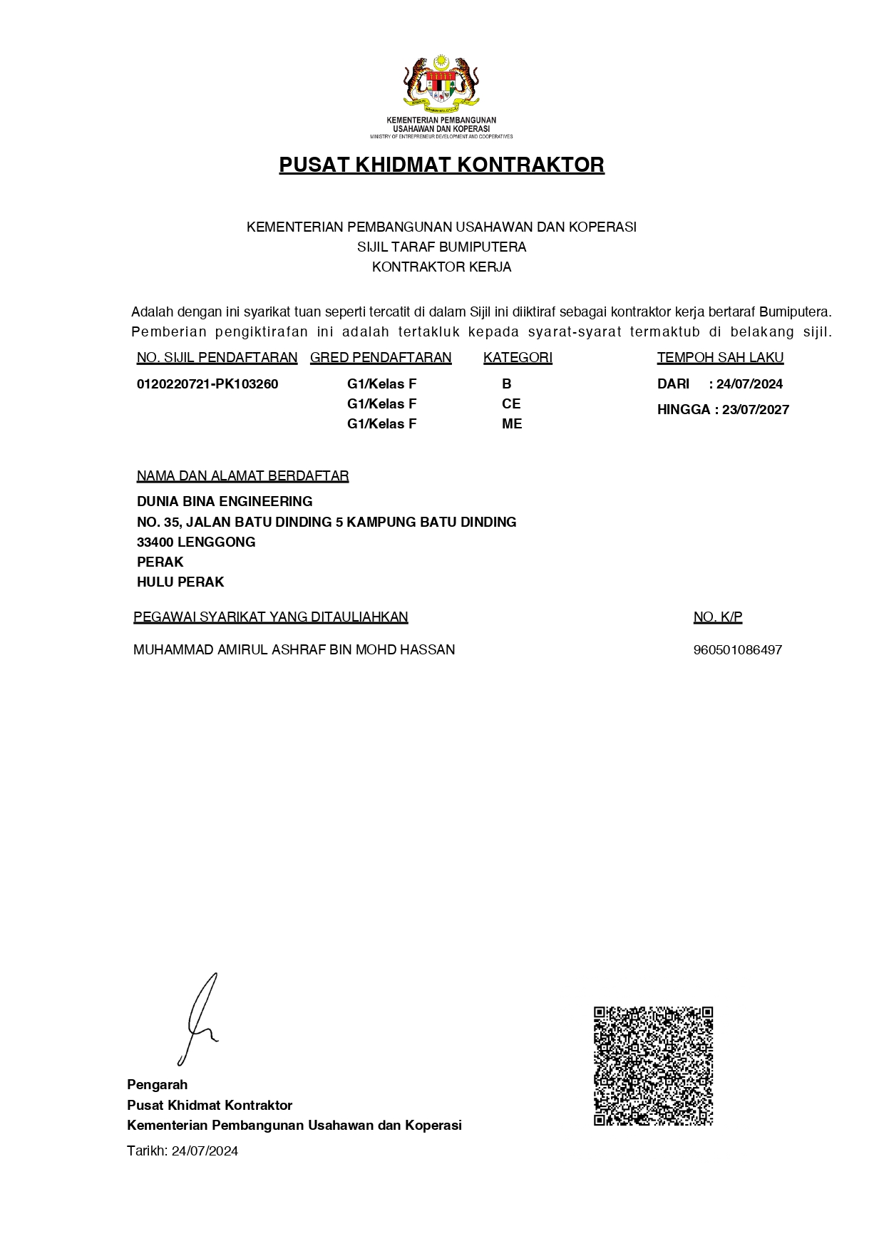 Berdaftar dengan SSM dan CIDB serta layak melaksanakan projek kerajaan dan swasta.