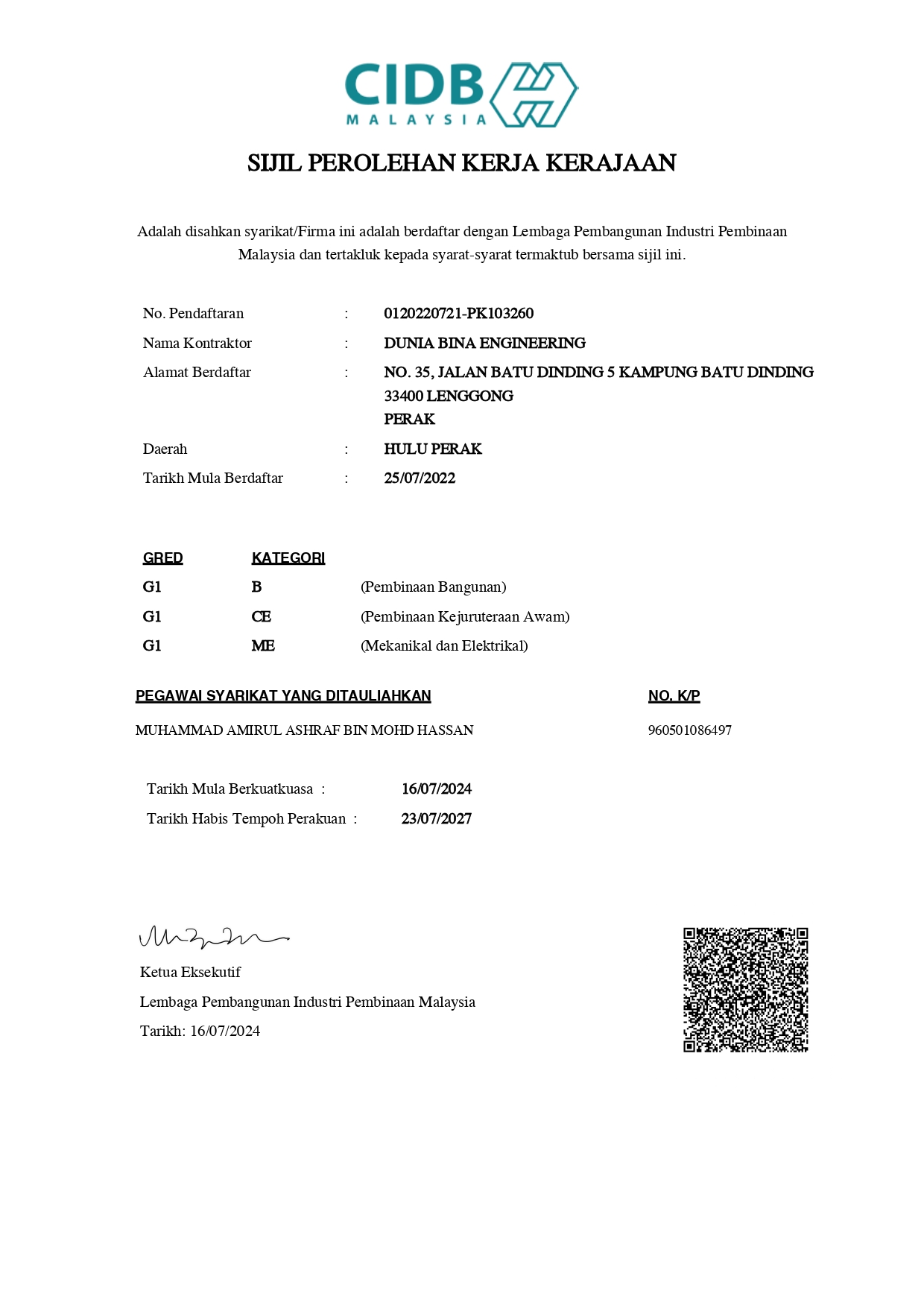 Berdaftar dengan SSM dan CIDB serta layak melaksanakan projek kerajaan dan swasta.